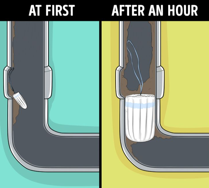 Tampons Binden und ähnliche Produkte sind für hohe Aufnahmekapazität konstruiert. Im Wasser dehnen sie sich aus behalten Form und lösen sich nicht auf. Dadurch blockieren sie leicht Siphons oder tieferliegende Rohrabschnitte.