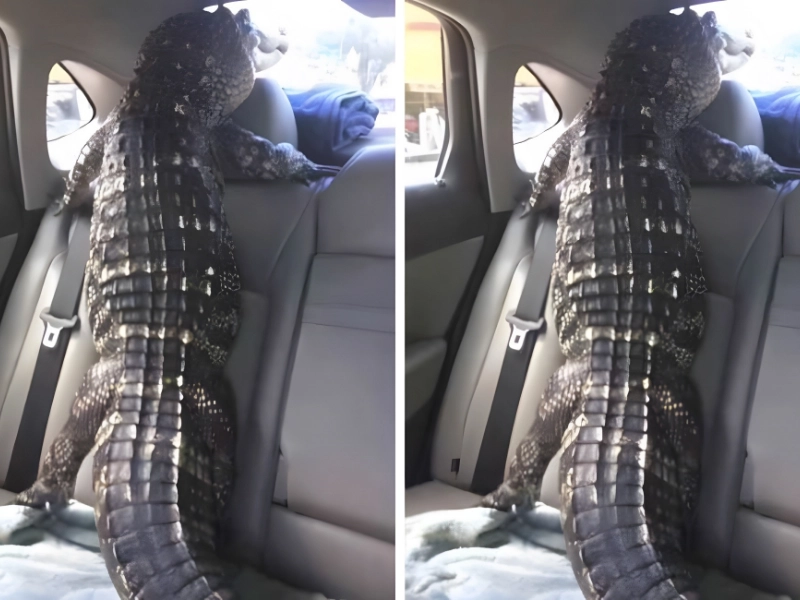 Dieser Alligator schaut aus dem Rückfenster eines Autos, als ob er nach Polizisten Ausschau hält. Die Geschichte hinter diesem Foto bleibt ein Rätsel – aber es ist definitiv nicht legal, einen Alligator als Beifahrer zu haben.