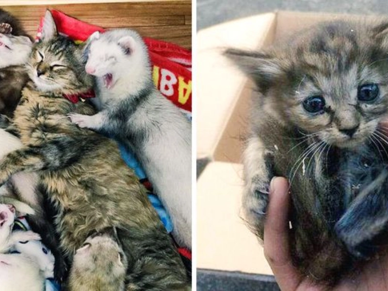Das zugelaufene Kätzchen Komari wurde von einer Gruppe aus fünf zahmen Frettchen freundlich aufgenommen. Die Tiere akzeptierten sie wie eine Schwester und Komari wuchs inmitten der kleinen Gemeinschaft auf. Noch immer kuschelt sie gern mit ihren Gefährten und zeigt wie harmonisch unterschiedliche Tierarten zusammenleben können.