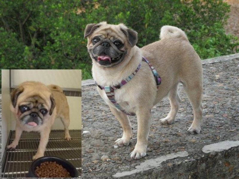 Die Besitzerin von Patches veröffentlichte Bilder vor und nach der Adoption ihres Mopses. Man erkennt deutlich wie aus einem unsicheren Tier ein geschätztes ruhiges Familienmitglied geworden ist das Nähe sucht und Vertrauen aufgebaut hat.