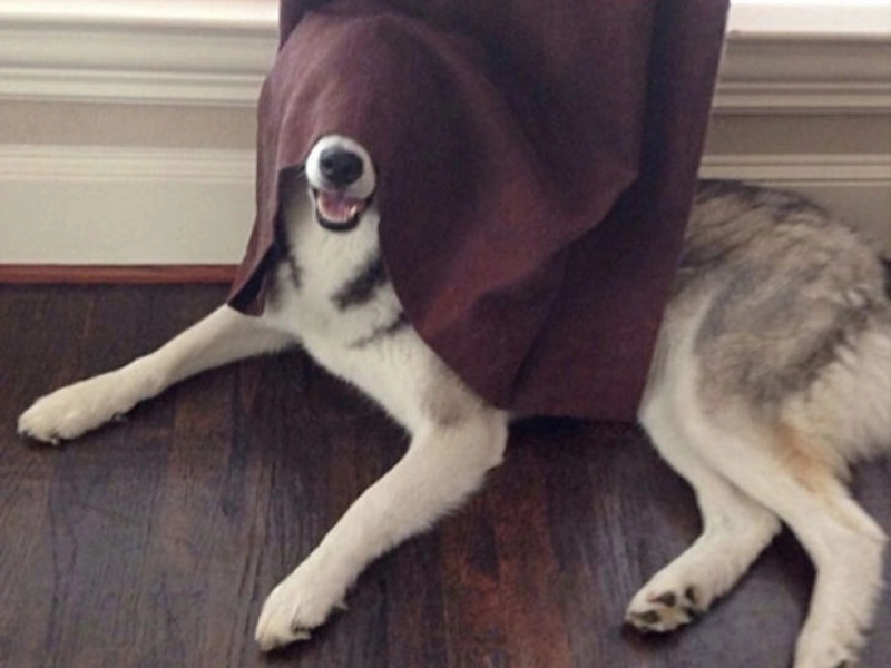 Für viele Hunde ist der Raum hinter einem Vorhang das ideale Versteck. Der weiche Stoff vermittelt Geborgenheit und Abschirmung und bildet eine kleine Welt in der sie sich unbeobachtet fühlen. Dank feinem Gehör lauschen sie auf Schritte oder Stimmen und verharren still bis sie meinen der Augenblick sei günstig. Das sanfte Schwingen des Stoffes verleiht dem Spiel eine leise Spannung. Ob sie neugierig hervorlugen oder vollständig verborgen bleiben dieser simple Ort bietet immer wieder Anlass für heitere Szenen und staunende Blicke.