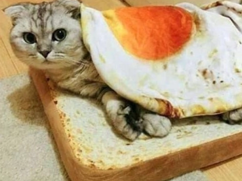 It's just a cat sitting on a bread-like pillow.