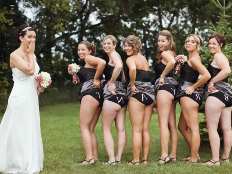 Diese Brautjungfern kennen keine Zurückhaltung wenn es um Spaß geht. Ihre ungezwungene Ausstrahlung macht das Bild markant und sorgt dafür dass es lange im kollektiven Gedächtnis der Feier verankert bleibt.