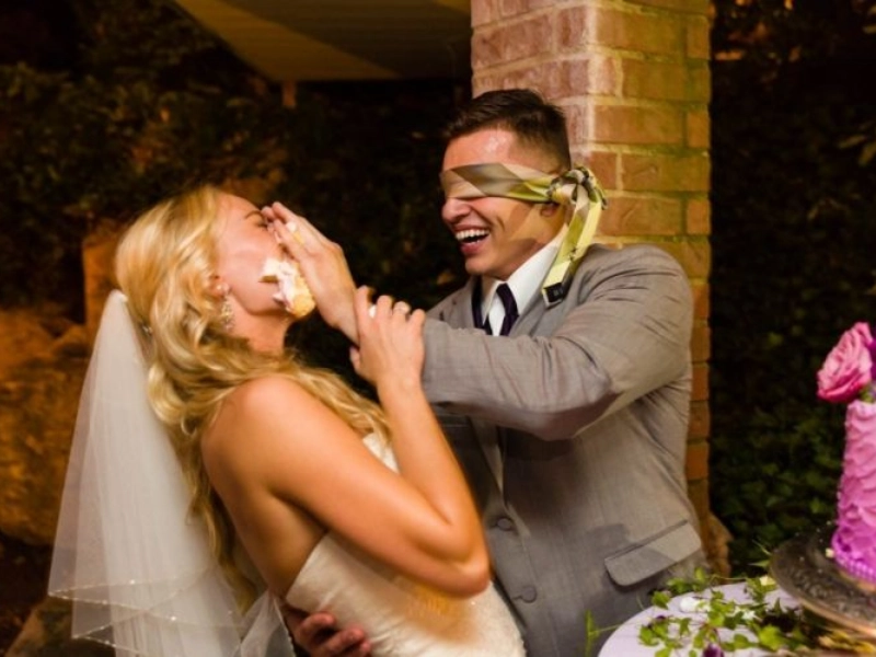 Der Bräutigam gab sich Mühe ihr liebevoll ein Stück Kuchen zu reichen voller Charme und guter Absicht. Das anschließende kleine Durcheinander machte die Szene nur sympathischer und ließ einen süßen Moment entstehen über den beide zukünftig schmunzelnd sprechen werden.