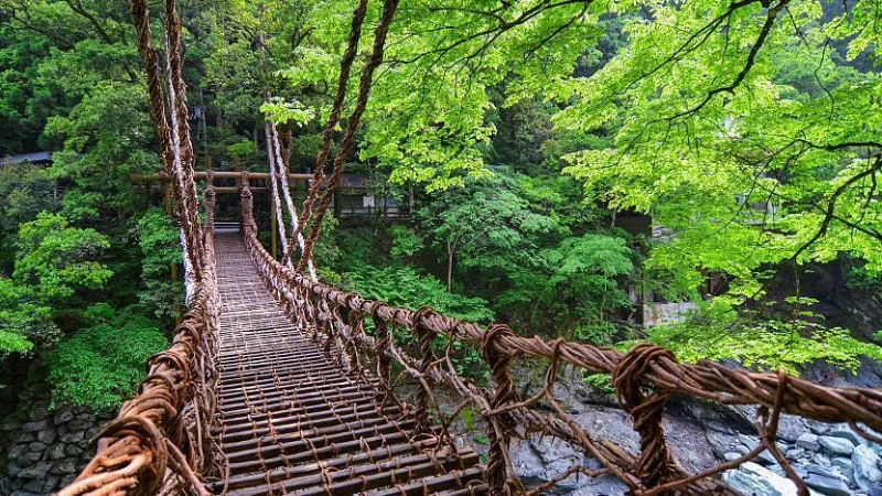 Tief im Iya Tal ist die Kazurabashi Brücke aus Bergreben geflochten und vermittelt einen Eindruck traditioneller Bauweise ländlicher Regionen Japans. Leises Knarren und sanftes Schwingen unterstreichen die historische Bauart. Zur Ergänzung werden in regelmäßigen Abständen Stahlseile integriert um zusätzliche Stabilität zu gewährleisten. Beim Hinabblicken durch Zwischenräume ist das Wasser weit unten zu sehen wodurch Vergangenheit und Gegenwart eindrucksvoll verschmelzen.