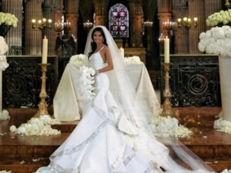 Eva Longoria trug ein Kleid von Angel Sanchez aus edlem Organza und Seide. Die fließende Form und sorgfältige Verarbeitung vermittelten zurückhaltende Raffinesse. Ihre Wahl wurde zu einem Beispiel für hollywoodtypische Stilsicherheit und inspiriert Bräute die Anmut und moderne Klarheit kombinieren möchten.