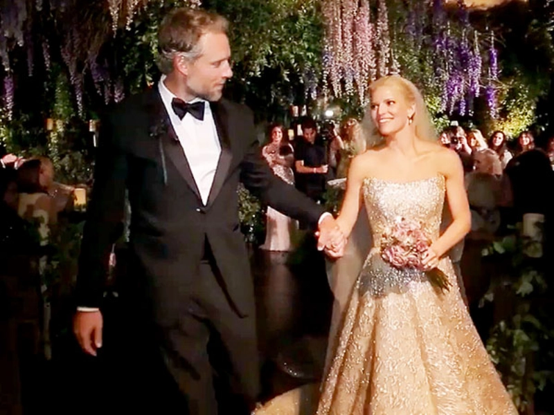 Jessica Simpson trug außerdem ein eindrucksvolles marengograues Vera Wang Kleid das ihre Vorliebe für feine Eleganz zeigte. Zarte Linien und erstklassiger Stoff formten ein harmonisches Gesamtbild und festigten ihren Ruf für zeitlose Stilsicherheit.