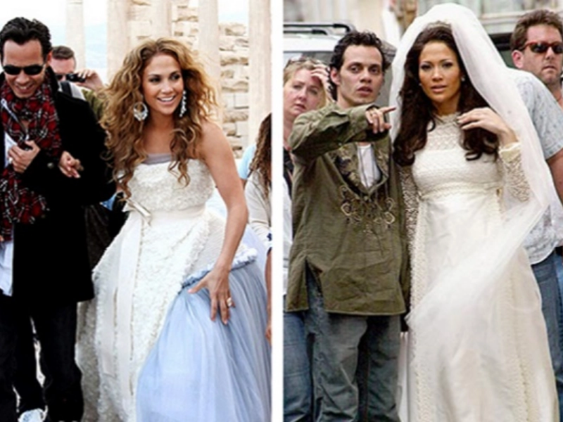Jennifer Lopez heiratete Marc Anthony 2004 in einem ausdrucksstarken Vera Wang Kleid. Handwerkliche Detailarbeit und eine vorteilhafte Linienführung unterstrichen ihren charakteristischen Glamour und machten den Auftritt zu einem besonders erinnerungswürdigen Mode Moment.