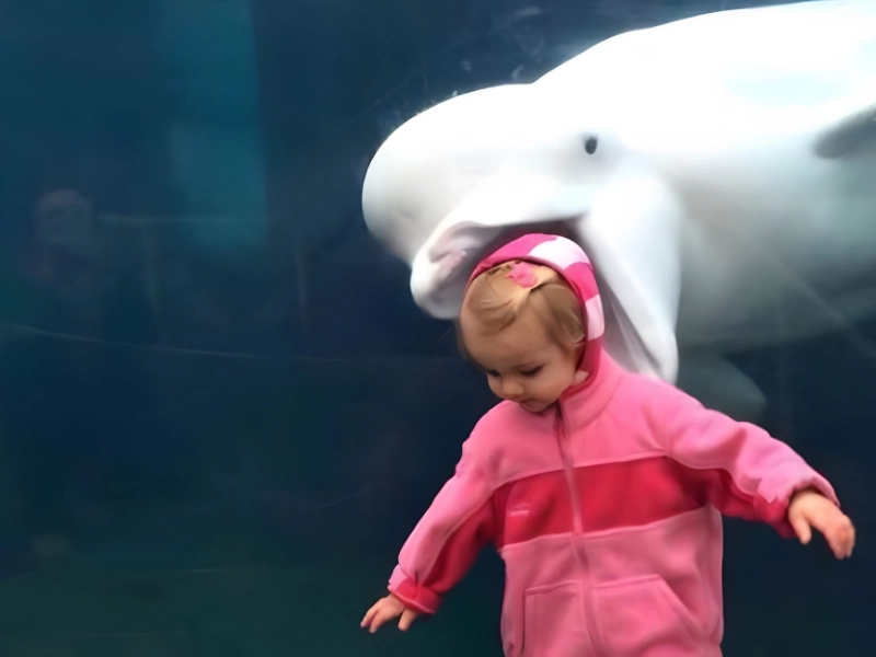 This dolphin seems ready for a snack, and the child is blissfully unaware. Luckily, thick glass keeps them apart.