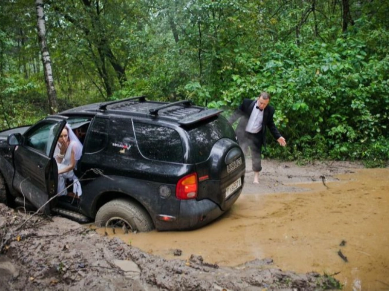 That's right, darling—time to push the car! Unexpected challenges like this turn a wedding day into an adventure, creating memories that are impossible to forget.
