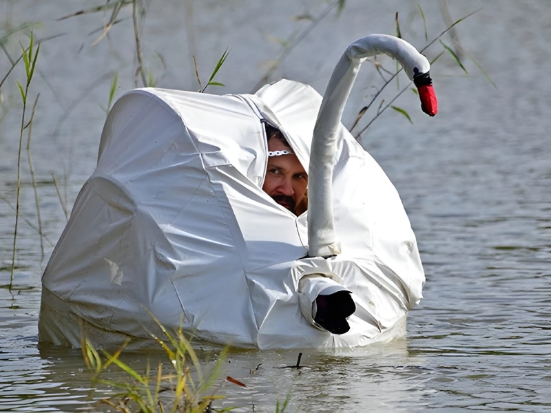 The main thing is that the swan doesn't fall in love with him. Dressed in white and floating serenely, the subject could easily be mistaken for one of the elegant birds nearby. This whimsical scene blurs the boundaries between human and animal, creating a moment of gentle humor and poetic beauty that invites us to imagine a world where such mix-ups are possible.