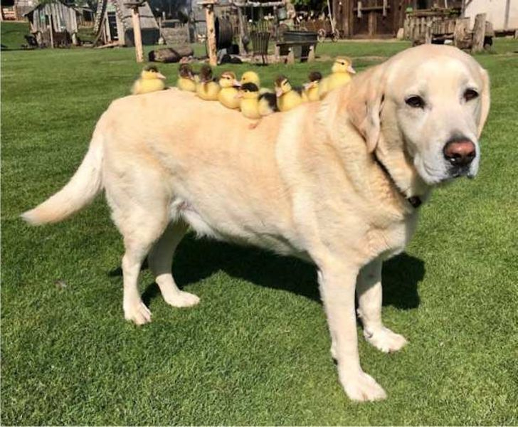 3. After the mother of nine ducklings disappeared, this castle dog adopted them.
