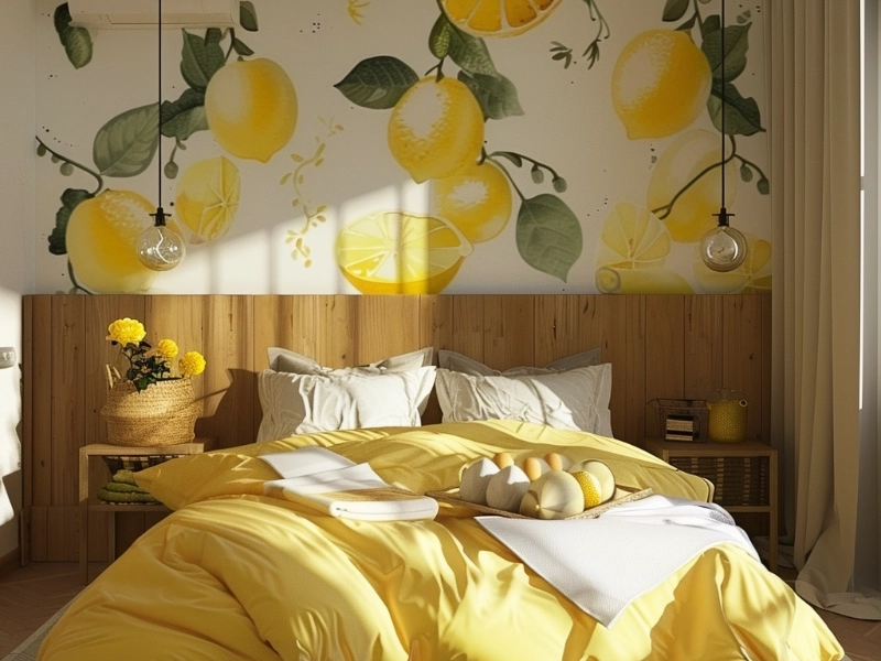For a more subdued approach, think about including lemon-themed décor accents. Without actual fruit, throw pillows with lemon designs, artwork with citrous themes, or even lemon-scented candles can bring lemons into your bedroom. These components provide a coherent and reviving look by tying into a more general citrous or botanical motif.