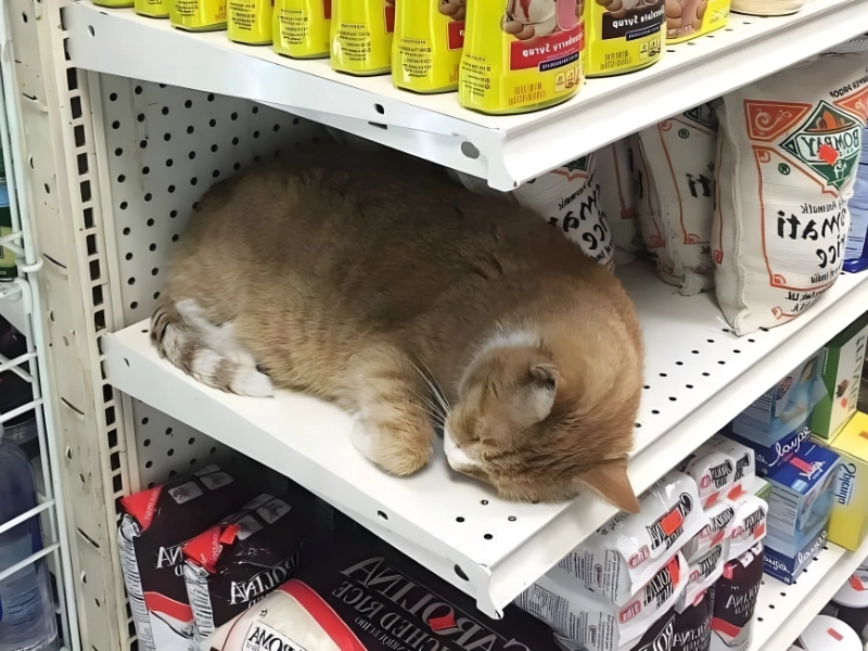 Potential Camera: iPhone Where to buy: Amazon, Walmart, and the Apple Store Average Price: $500–1,200* The caption reads, "Thank goodness they are back in stock," referring to the orange cat sleeping on a grocery shelf. This cat looks like the boss or maybe just a tired employee.