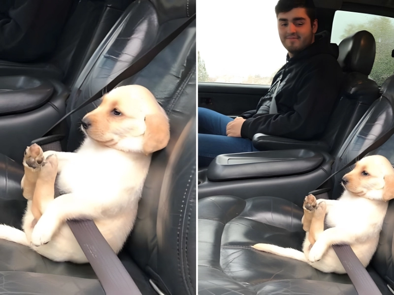 We love seeing both humans and pets take safety seriously. This puppy sits calmly in the car, seatbelt fastened, ready for the journey ahead.
