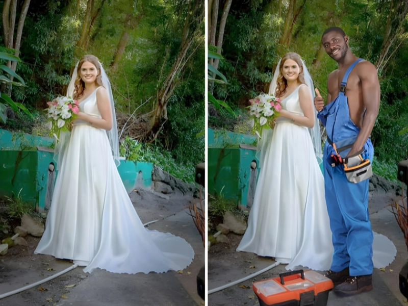 This bride-to- be had pictures shot near the edge of a building site for whatever reason. Strange green walls and an odd pipe flowing across the earth abound. She requested the pipe to be taken off since it seemed so out of place. The man who altered this picture just added a plumber to make the pipe seem more "natural," instead of eliminating it.