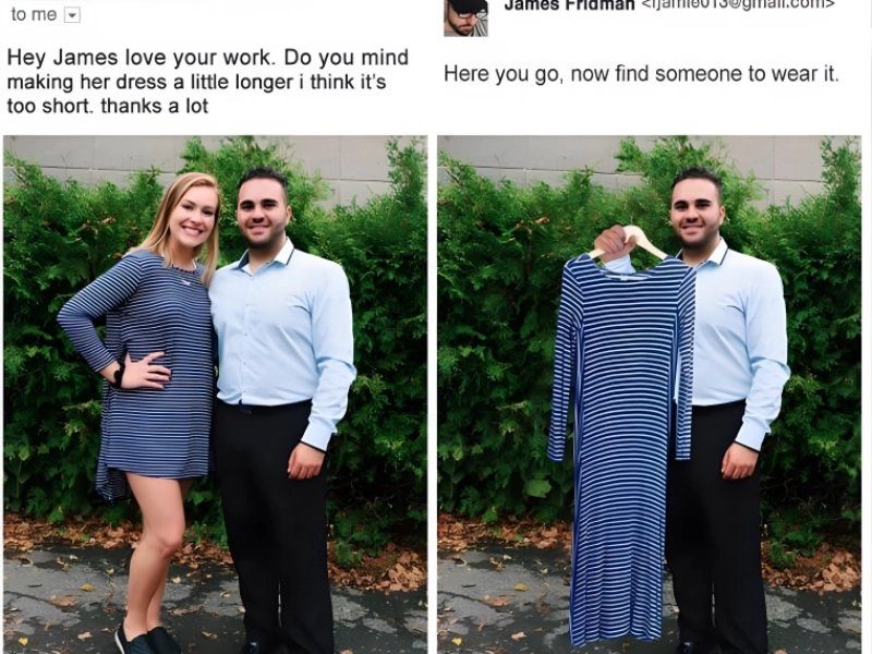 Though it's a really little remark, it's usually not a good idea to criticise someone's outfit. This guy thought the girl's dress looked excessively lengthy, hence he asked that it be reduced. But in the second picture he obtained more (or less) than he had expected. The dress was spread, but he lost the girl. We now doubt whether that was his girlfriend, but even so.