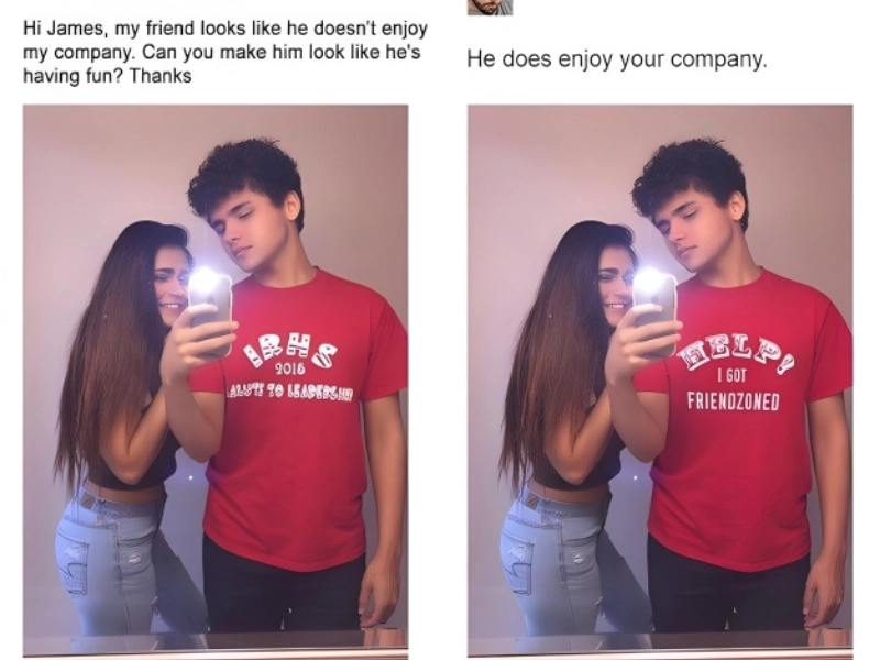 This one is so fantastic that initially it's quite difficult to tell these two images apart. This girl asked that her companion be made to seem as though he was having fun as she felt he didn't look like he was enjoying their time together. Though the alteration here is still funny, this is most likely the only one on the list that doesn't get precisely fulfilled in some form.
