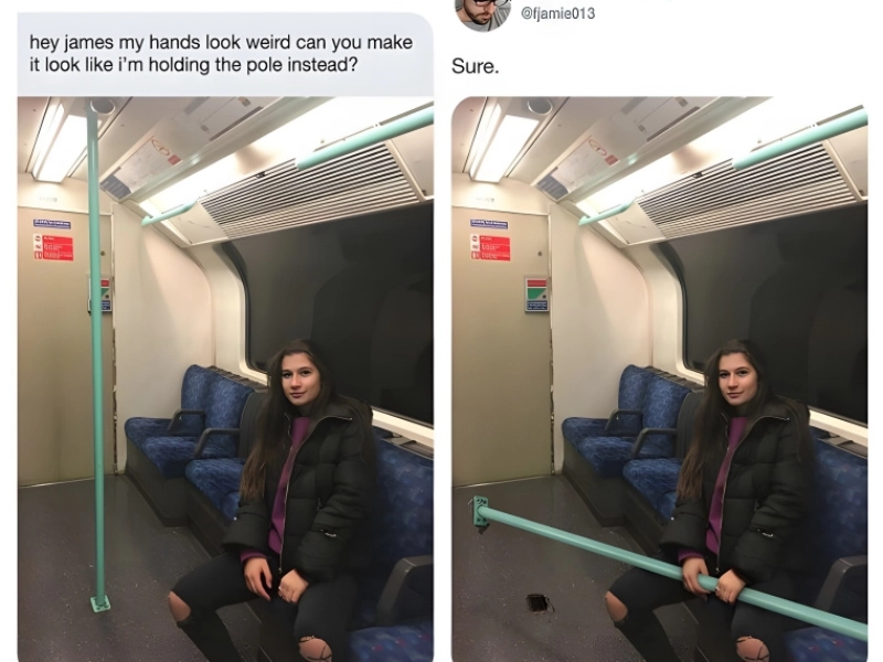 Here is another picture showing someone unhappy with their hands and arms. To be honest, they appear great to us here. After all, what else could you be doing with them on your metro ride? The man then grabbed the pole from the middle of the automobile to give the impression that she had carelessly torn it down and was clutching it in her hands.