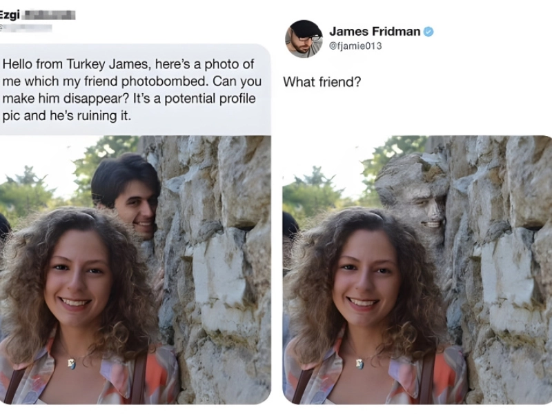 Everybody has one friend that simply shows up out of nowhere and photobombs a possibly fantastic picture. This girl asked that her companion be taken from the backdrop since she wanted to use this picture as a profile shot. very, he was merely merged into the stone wall; once you see that, it's very unsettling. She should still absolutely use this as her profile picture though.