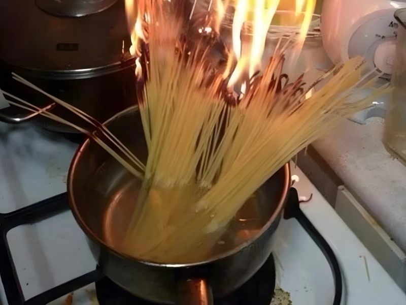 スパゲッティがまるでホームデポで買えるどんなものでも火をつけるのと同じくらい効果的に燃えていることがわかります。キッチンも散らかっていて、この画像全体が不安をかき立てます。この場所は混沌として汚く、火事の危険性が高いです。ここで夕食を食べたいとは思いません。