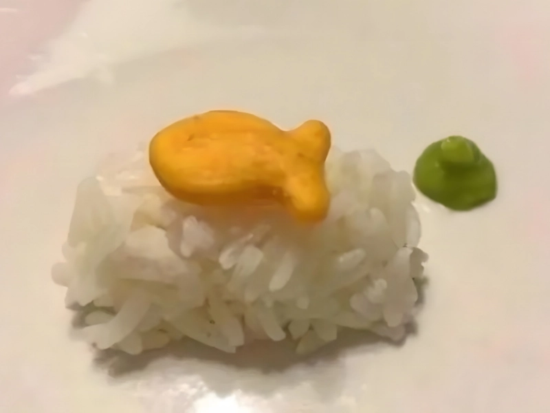 新米寿司職人 推定価格: 2ドル* 出来上がったのは、ごく基本的な寿司の作り方でした。この写真のキャプションには、被写体は初心者の寿司職人と書かれています。この料理は、少量のワサビ、白米、そしてその上に金魚が乗っています。これは寿司でしょうか?いいえ。食べられるものでしょうか?はい、食べられます。