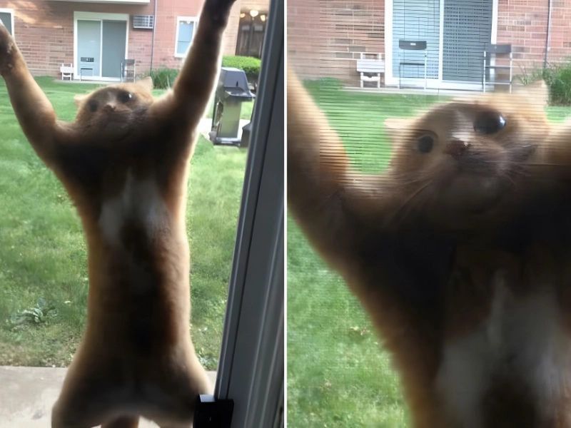 このオレンジ色の猫は、地面からわずか数フィート上にいるように見えます。まるで必死につかまっているかのようです。間違いなく、彼はこれを利用して飼い主の注意を引き、屋外で彼を怖がらせているものから逃れて中に入ることを許可してもらおうとしています。