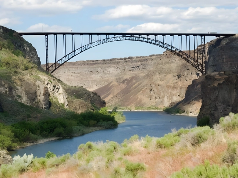 米国アイダホ州のスネーク川渓谷にそびえ立つペリン橋は、アイダホ州ツインフォールズとジェローム郡を結んでいます。1976 年に推定 1,000 万ドルの費用で建設されたこの鋼製アーチ橋は、全長 1,500 フィートの魅惑的な橋です。