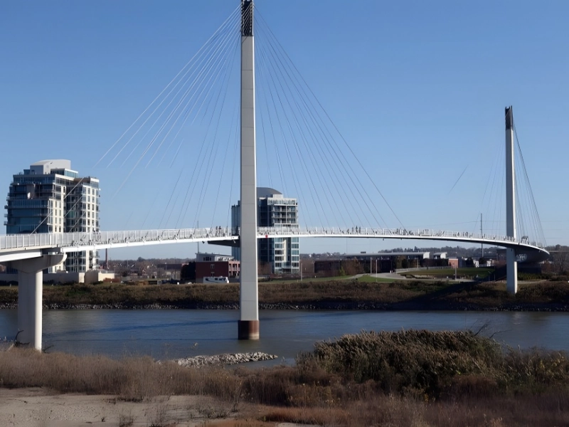 ボブ ケリー歩行者橋は、ネブラスカ州とアイオワ州の間のミズーリ川に架かる橋で、州間協力と都市再開発の取り組みの一例です。アイオワ州カウンシルブラッフスとネブラスカ州オマハを結ぶこの 2,200 万ドルの斜張橋は、自転車と歩行者の両方にとって美しいルートを提供します。2008 年に完成しました。