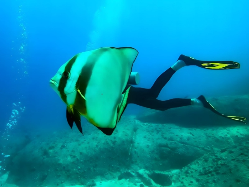 Festgehalten: Eine Illusion wie eine Meerjungfrau In dieser humorvollen Aufnahme wird eine Taucherin von einem vorbeiziehenden Fledermausfisch teilweise verdeckt sodass die Silhouette wie eine fantastische Figur erscheint. Ein glücklicher Treffer für eine neue Taucherin der zusätzlich Neugier auf die Unterwasserwelt weckt.