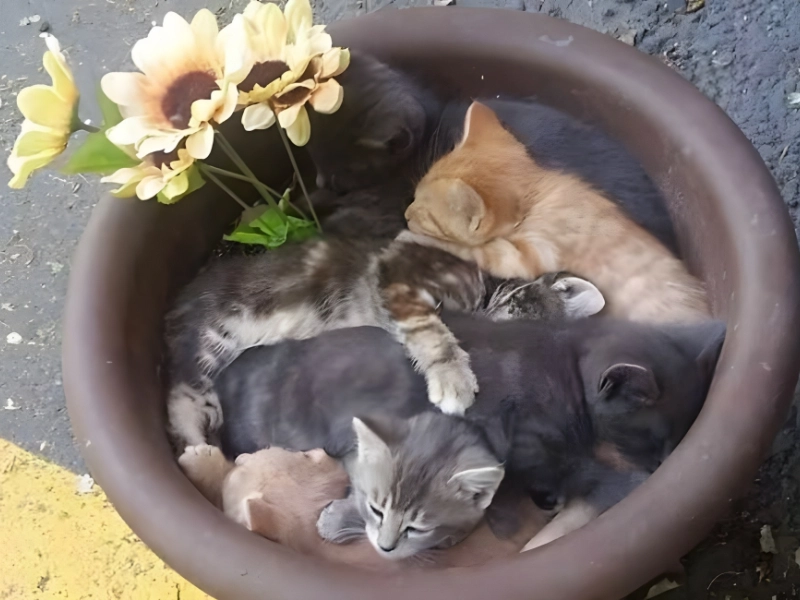 Jede Halterin kennt den Moment in dem eine Katze plötzlich auftaucht und an einem unerwarteten Ort ausgiebig gähnt. Dieses amüsante Foto zeigt einen Topf gefüllt mit zusammengerollten Katzen und fängt genau diesen charmanten Überraschungseffekt ein.