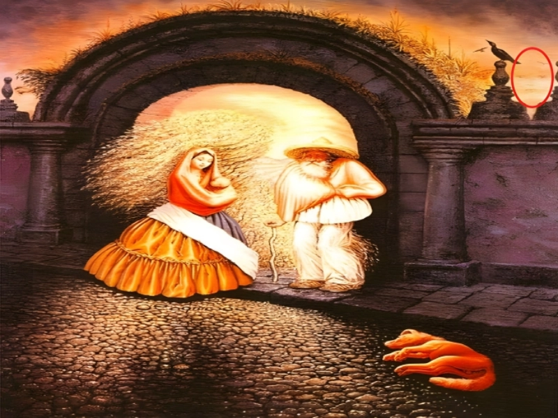 This face is the most challenging to notice. Birds create the illusion of a face, forming the nose and eyes, and are hidden between two other faces.