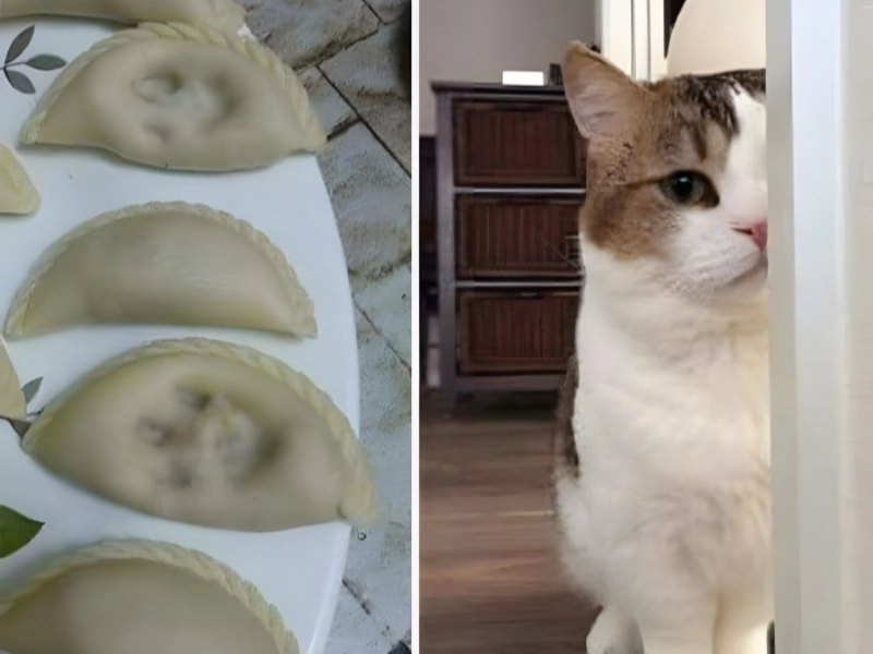 Die Komik entsteht durch die klar umrissenen Abdrücke in fluffigem Teig die ganz ohne Zeugen eine Geschichte leisen Katzenspiels erzählen. Die gelassene Haltung des Tieres verstärkt den Humor als wisse es genau um die Aufmerksamkeit und nehme sie mit stoischer Ruhe hin. Man kann sich den Moment ausmalen Duft von frischer Backware eine kurze unbeobachtete Minute und die bewusste Entscheidung eine Signatur zu hinterlassen. Darum wissen Katzenhalter dass man Essen besser nicht einmal kurz stehen lässt. Die eigentliche Frage bleibt ob jemand später noch die unberührten Teilchen genießen wollte oder ob nun alles verdächtig erschien.