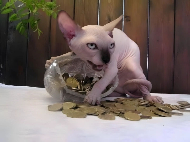 Dieses Bild schreit nach Erklärung. Warum sammelt diese Katze Münzen. Handelt es sich um echtes Geld oder Spielmarken. Und weshalb ist sie nackt beziehungsweise haarlos. Die entscheidende Frage lautet würdest du versuchen etwas zu nehmen oder respektvoll weitergehen.