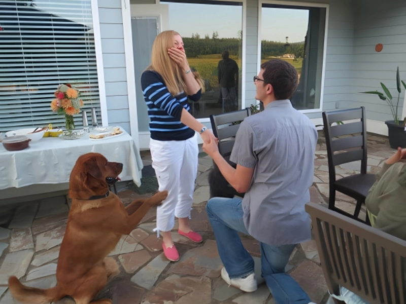 Verhält sich dieser Hund nicht einfach großartig. Während der Mann seiner Partnerin einen Antrag macht schiebt sich der Hund freundlich ins Bild fast als würde er ebenfalls um ein kleines Schmuckstück bitten. Der Augenblick ist wirklich einzigartig und die unschuldige Haltung des Tieres gewinnt sofort alle Herzen. Offenbar wurde der treue Gefährte gut erzogen und präsentiert sich nun als perfekter Begleiter in diesem wichtigen Lebensmoment. Betrachtet man es erneut könnte man auch denken der Hund warte auf eine eigene symbolische Geste vom Bräutigam.