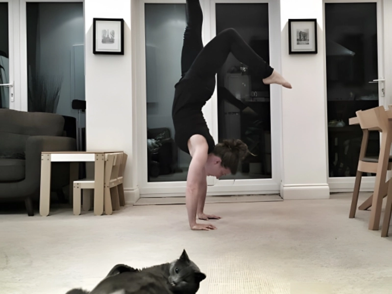 Diese Katze präsentiert eine Haltung ähnlich einer Übung mit nach unten gerichteter Ausrichtung. Während die Person Yoga macht demonstriert das Tier eigene Bewegungen. Vielleicht findet die Katze den Menschen etwas ungewohnt oder fühlt sich anfänglich unsicher. Dennoch zählt das Ausprobieren und selbst ein ruhiges Tier kann durch kleine Wiederholungen flexibler werden.