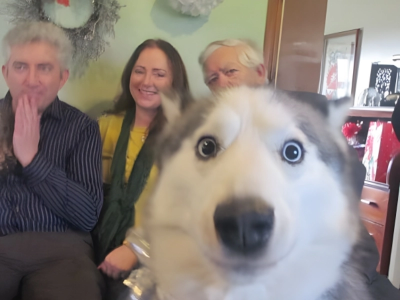 Dieser Hund wirkt neugierig und schenkt dem Familienfoto sein bestes Lächeln. Wahrscheinlich möchte er einfach dabei sein und hebt dadurch die Qualität des Bildes noch an. Niemand kann diesem freundlichen Ausdruck widerstehen. Seine Mimik sorgt für zusätzliche Komik. Ein Lob als guter Hund und er wird beim nächsten Mal vielleicht noch strahlender schauen. Hunde in Familienfotos verleihen Aufnahmen fast immer zusätzlichen Charme.
