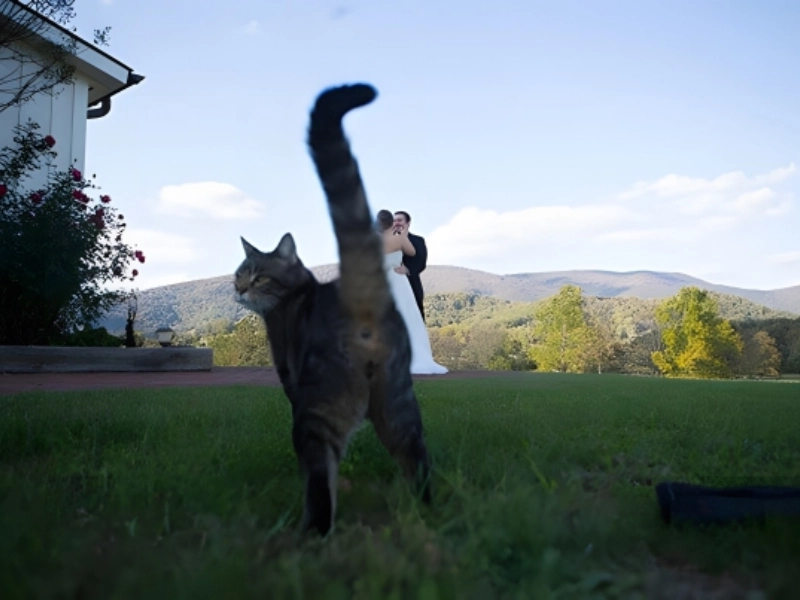 Hoppla dieses Foto ist gewagt aber auf harmlose Weise. Katzen zeigen ihren Menschen oft selbstbewusst ihre Rückseite als Zeichen des Vertrauens. Hier scheint die Katze eine Art Kommentar zur Hochzeit abzugeben. Genau solche direkten Momente machen Katzen so unvergesslich.