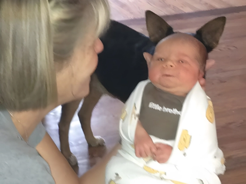 Auf den ersten Blick wirkt es wie eine seltene Aufnahme von Baby Yoda. Seit Auftritten in The Mandalorian wünschen sich viele mehr solcher Eindrücke. Natürlich ist es kein echter Baby Yoda sondern eine perfekt getimte Hundeposition die dem Baby große Ohren verleiht. Das Kind denkt vielleicht Ich höre alles Mama.